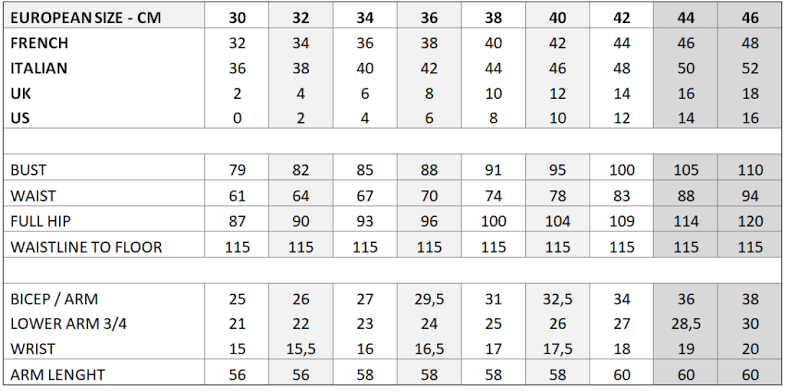Please see the sizing chart as a reference when placing an order. It is important that all measurements are taken by a tailor in order to ensure they are accurate. This will enable you to receive the most suitable dress according to your specific size.